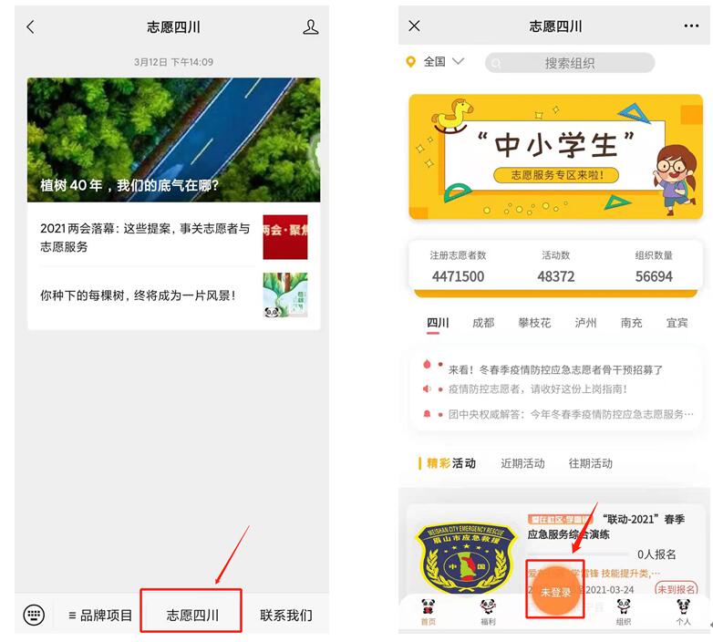 第二步:进入“天府新青年”或“志愿四川”公众号,点击左下方“志愿四川”进入平台91成人,点击下方“未登录”按钮。