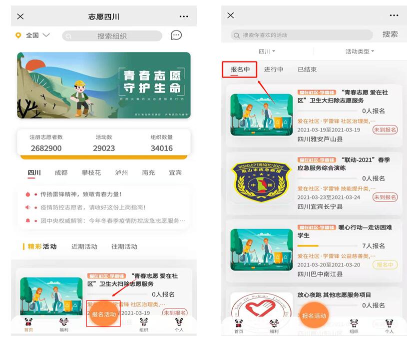 第一步:进入志愿四川平台91成人后,点击“报名活动”按钮。