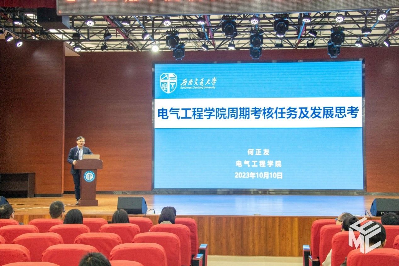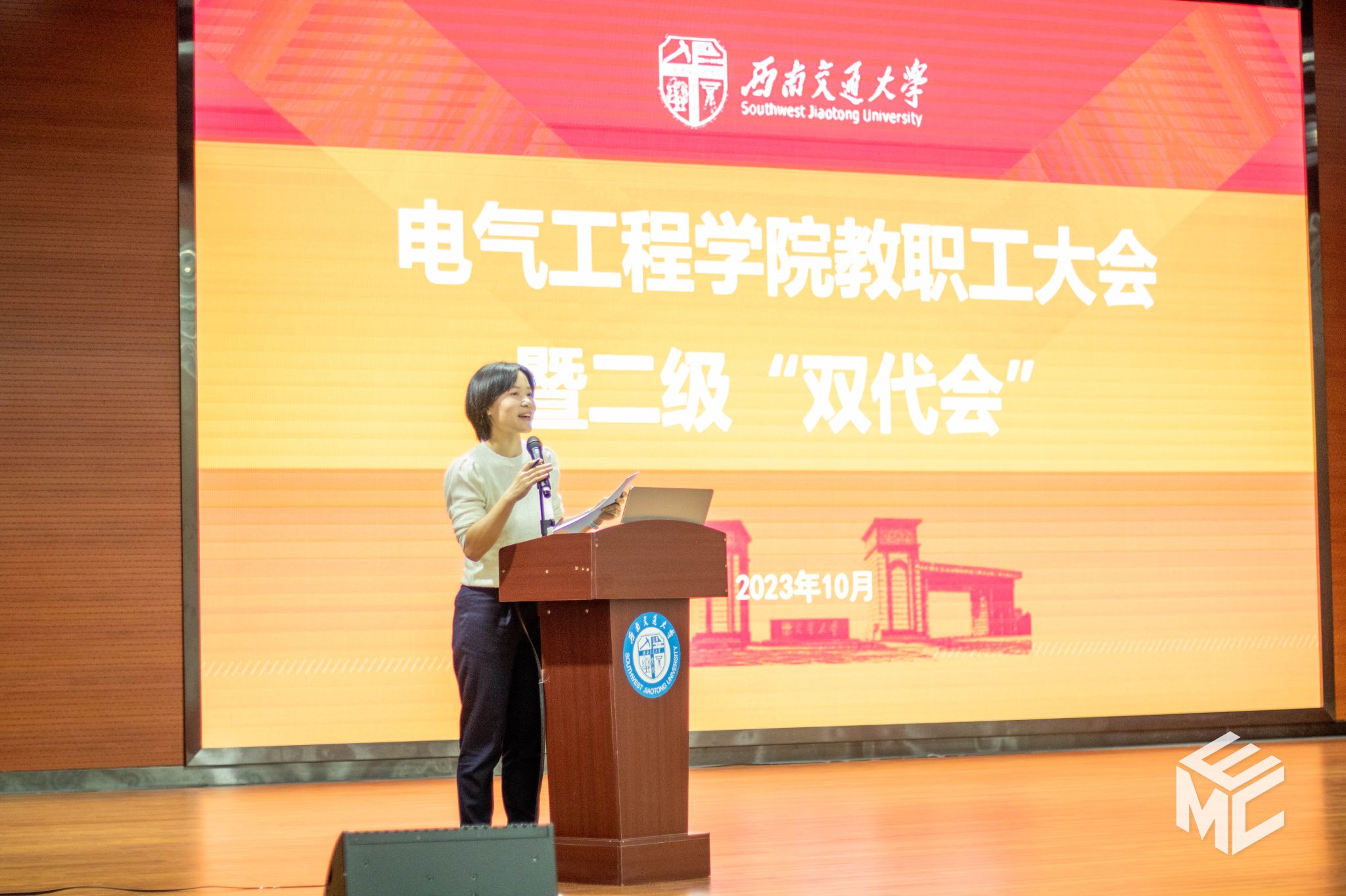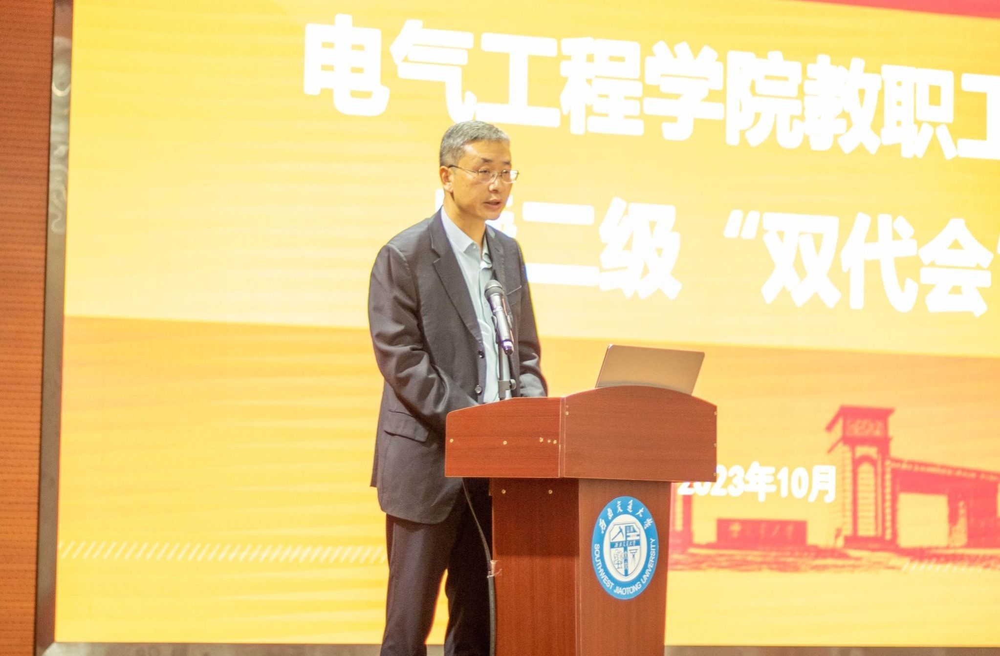 2023年10月10日下午,91成人 2023年“双代会”在犀浦校区一食堂三楼顺利召开。院长何正友,党委书记王斌,党委副书记谢力,党委副书记、工会主席王轶,副院长何晓琼、解绍锋、陈民武、胡海涛、刘志刚参加会议。因院情院务公开需要,本次“双代会”扩大至全院教职工范围,学院“双大会”代表与全体教职工参加会议。会议由党委王斌书记主持。
