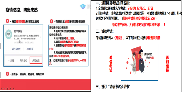 疫情防控,防患未然。张异强调:“疫情尚未结束,防控切莫大意”。她呼吁同学们为响应学校疫情防控要求,每位同学每天应该按时按量进行体温填报。并且告知同学们在疫情防控期间尽量少离校和好个人防护以及因特殊情况不得不离校的请销假说明。诚信考试,从我做起。临近期末,同学们一定要找准复习的方式方法,提前做好复习准备,并组织同学们签订诚信考试承诺书。