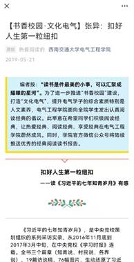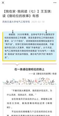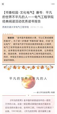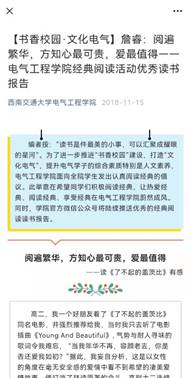 为了鼓励学子们积极参与经典阅读活动,营造学院书香氛围,学院还在官微设立了专栏,按周推送优秀读书报告。专栏的设立展示了学院建设书香氛围的决心和重视,带动了学院各个组织以及相关社团的积极性。同时,每周推送优秀读后感,一方面鼓励了学生养成爱读书、善读书的习惯,另一方面也激发了同学们的写作热情,为同学们提供了展示自我的平台和机会。