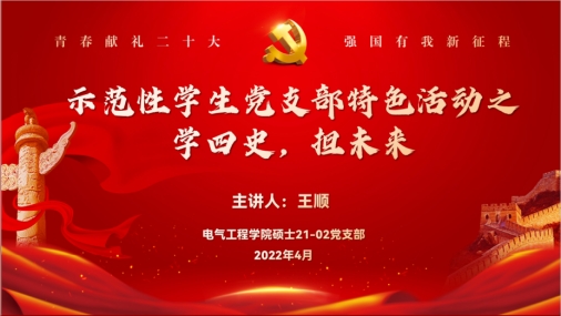 为深入学习贯彻习近平新时代中国特色社会主义思想,引领学生党员深刻领悟“两个确立”的决定性意义,增强“四个意识”,坚定“四个自信”,弘扬伟大建党精神,91成人 硕士2021级第二党支部于4月27日,在犀浦校区电气馆10831会议室开展了“凝聚青春力量,争做先锋电气人”系列特色活动。本次活动主要进行学习“四史”征程和观看“红色”影视两方面内容,由支部书记王顺同志担任主持,支部全体党员同志以及入党积极分子共同参加。