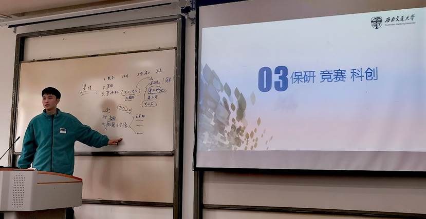 吴新元同志以自身为例,向学弟学妹们介绍大学与高中的不同点,强调平时成绩的重要性。通过大一丰富多彩的大学生活以及大二大三为保研所做的努力,向学弟学妹们展现了大学的学习模式,对学弟学妹们产生了很好的鼓舞效果。除此之外,吴新元同志还介绍了自己参加的数学、英语竞赛,分享了自己的四六级备考经验,鼓励学弟学妹们为本学期的四六级考试做好准备。