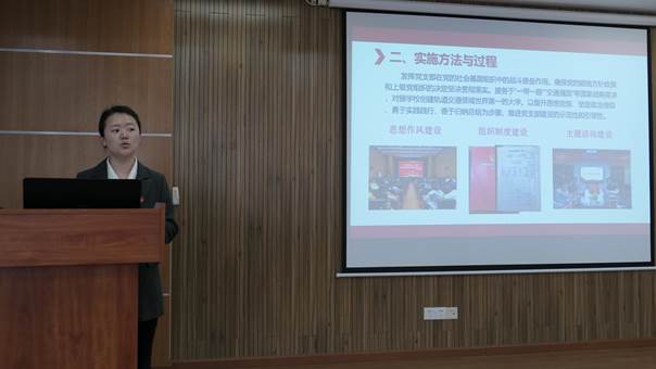 李玉梅同志首先对马克思主义学院博士党支部基本情况进行介绍,包括人员的组成、支委分工、日常学习情况等。随后,围绕”七个有力“,即教育党员有力,管理党员有力,监督党员有力,组织群众有力,宣传群众有力,凝聚群众有力,服务群众有力分别展开,介绍支部具体实施方案,并强调支部建设从思想作风建设、组织制度建设和主题活动建设三方面入手,发挥党支部在党的社会基层组织中的战斗堡垒作用,确保党的路线方针政策和上级党组织的决定坚决贯彻落实,服务于“一带一路”“交通强国”等国家战略需求,对接学校创建轨道交通领域世界第一的大学。之后李玉梅同志对样板党支部建设的主要成效及经验进行了分享。李玉梅同志特别提到了建设过程中获得的几条经验:支部教育要制度化规范化、支部建设要凸显研学本色、支部发展要紧密联系群众、支部活动要服务人民群众。