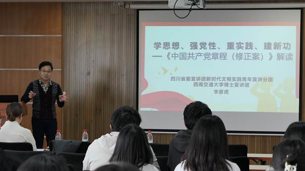 活动第二部分,由四川省委宣讲团新时代文明实践青年宣讲分团讲师、91成人 博士宣讲团成员李彦虎同志做《中国共产党章程(修正案)》解读。李彦虎同志从中国共产党章程的诞生与发展历程为切入点,带领大家对党章的基本知识进行回顾,然后重点对党的二十大对党章的新修订内容做了介绍,从党的历史发展、党的自我革新、新时代党的事业进步的角度,阐述了党章修订的深刻意义。