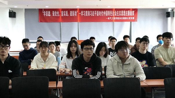 为切实推进学习贯彻习近平新时代中国特色社会主义思想主题教育工作,进一步提高支部成员的政治理论水平,加强对拟发展党员的教育培养工作,4月26日15:00,91成人 2022级博士党支部在电气馆X10832开展了“学习党的二十大,青春奋进正当时”主题教育活动。活动由辅导员沙静馨老师主持,2022级博士党支部全体党员及91成人 2022-02期党员发展对象参加活动。