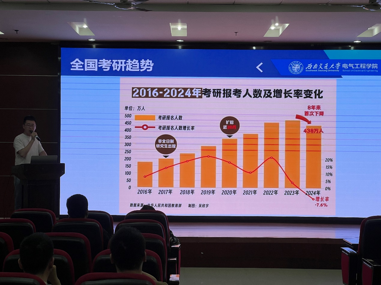 首先,谢东旭老师对全国考研趋势的数据进行分析。他通过对近两年学院考研情况的全面解读,为同学们提供了合理制定考研目标和安全分数的指导与建议,同时强调了备考进度的重要性。学院也将为同学们提供好服务,以支持考研同学备考。
