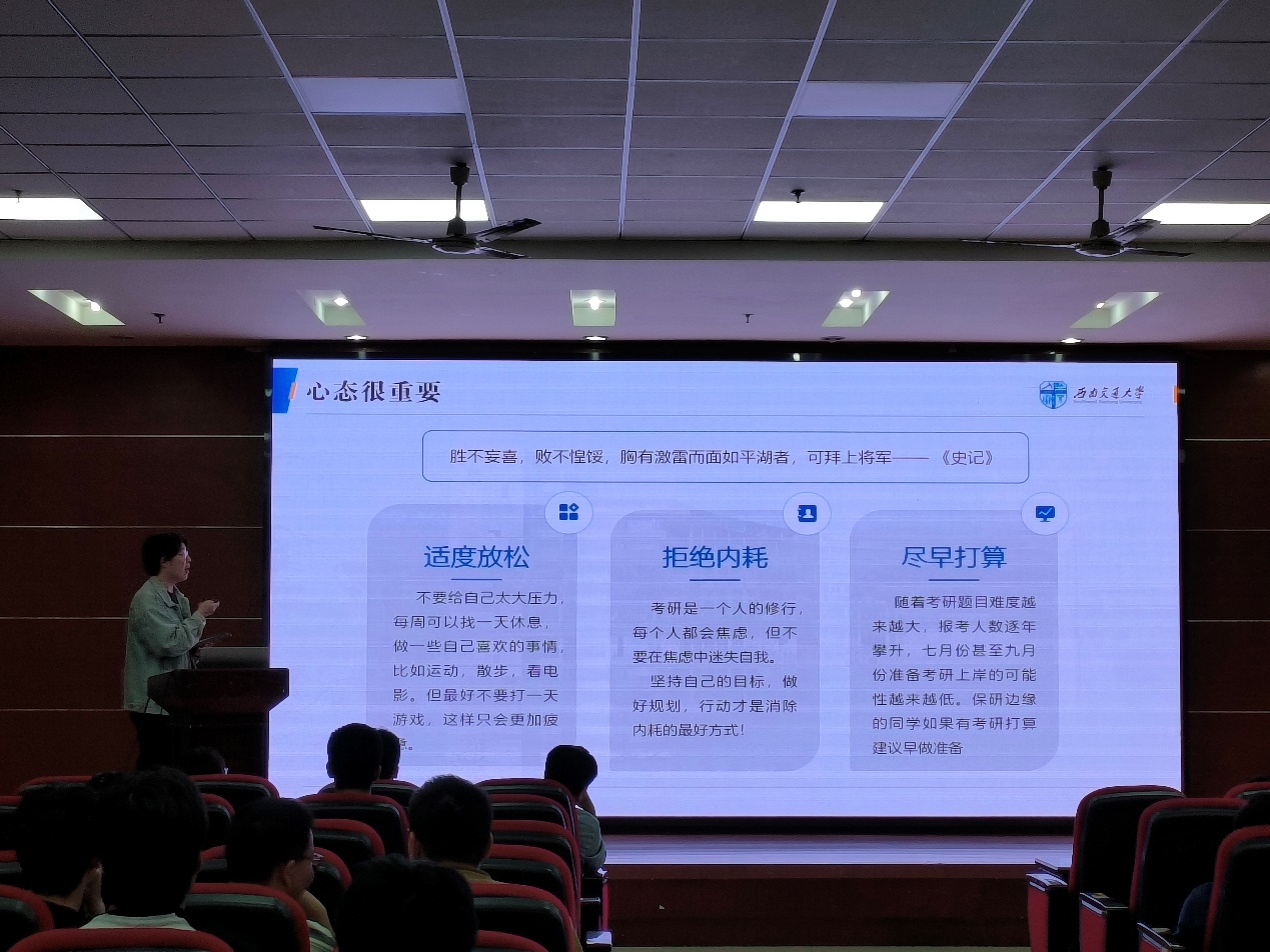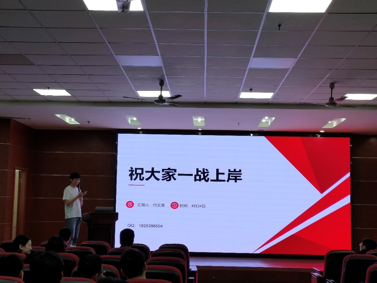 已成功上岸的学长们也分享了他们的宝贵经验。赵宇川学长强调了“选择大于努力”的重要性,建议同学们选择合适的地区和院校;付文涛学长指出,只要方向正确,努力就不会白费,他强调了找到自己的学习节奏和保持良好心态的重要性;张致远学长则引用“胜不妄喜,败不惶馁,胸有激雷而面如平湖者,可拜上将军”与同学们共勉,也强调平时积累的重要性。