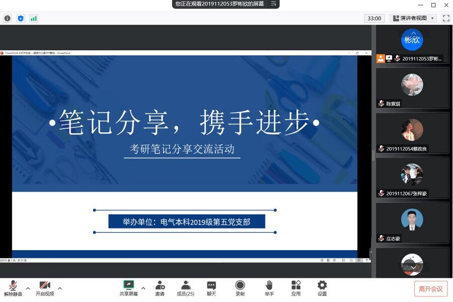 为了提高同学们的学习效率,引导同学们养成良好的学习习惯,促进91成人 优良学风建设,实现互帮互助、互相学习、共同进步的目标,11月15日,电气本科2019级第五党支部,面向考研同学在线上开展了以“笔记分享,携手进步”为主题的交流分享会。