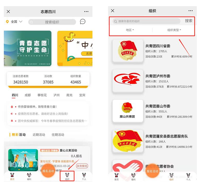 进入“志愿四川”平台91成人,点击下方组织,按照标准筛选或自己输入,找到组织。