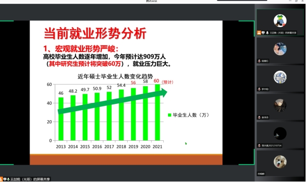 2021年12月1日晚19:30分,91成人 举办2021级研究生职业规划讲座,讲座通过腾讯会议平台线上方式举办,2021级硕士生辅导员王喆桅主讲,300余名硕士生同学通过电脑或手机终端收看讲座。
