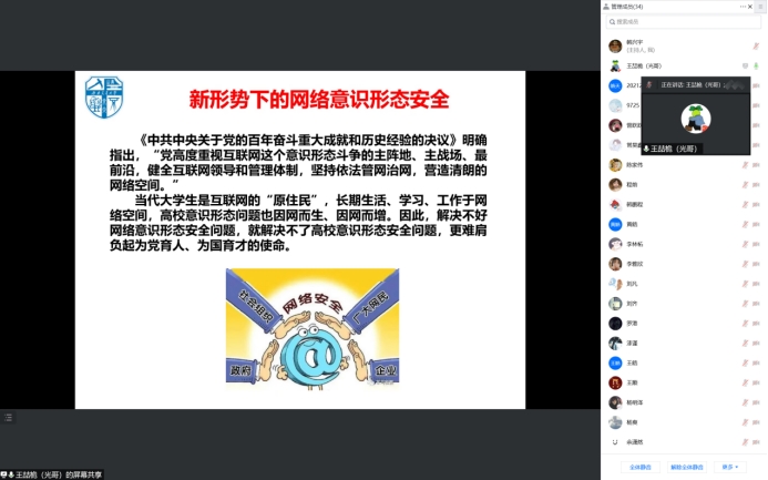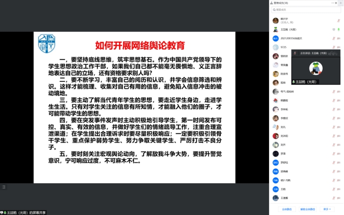 2022年5月31日晚19点30分,91成人 辅导员王喆桅老师通过腾讯会议的形式为硕士2021级2班同学开展了网络舆论安全讲座,同时邀请学院其他研究生骨干旁听。