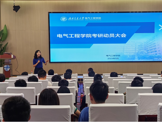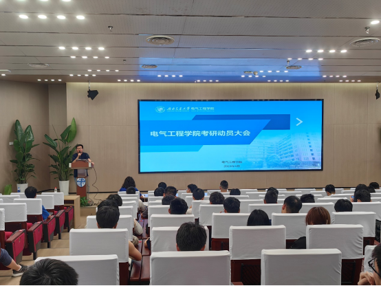 激励和支持学生积极备战考研,提高考研的成功率和录取率营造一个积极向上、勇于拼搏的考研氛围5月28日,电气本科2020级在图书馆一号报告厅召开考研动员年级大会,学院党委副书记谢力出席会议并讲话,年级大会由辅导员关怀、郭冰倩主讲,本科2020级全体学生参加会议。