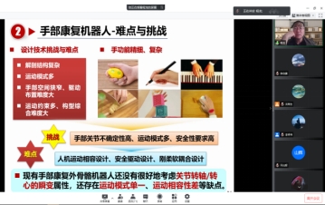 本次沙龙采用“线上+线下”的模式进行,由91成人 黄德青教授担任活动现场主持人,线上约80位师生共同参与,在线下,数十名对于机器人系统有着深厚兴趣和钻研的同学组成了一个观摩和研讨的小团队。程龙博士以“手部康复机器人设计、感知与控制”为题,首先介绍了自己所在的团队--中国科学院分子影像重点实验室,团队强大的人员队伍和雄厚的技术实力赢得在场所有人的赞叹。其后,程龙博士从研究背景、手部康复机器人系统设计和主被动康复训练方法三部分为同学们展开了深入浅出的讲解,既有学术的严谨又有报告的激情,在场的师生聚精会神听取,不错过任何学习的机会。