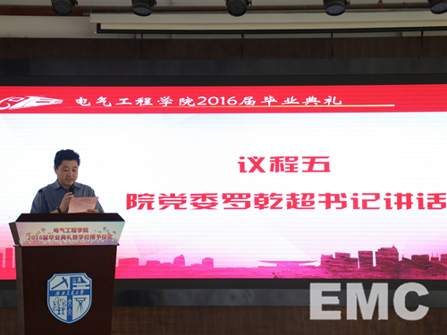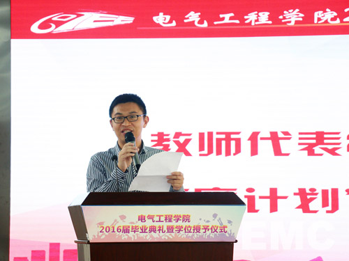 活动第二项内容是毕业典礼暨学位授予仪式。首先由教师代表李奇老师发言。李老师与毕业生分享三碗鸡汤。第一是希望大家能够坚定信念,保持年轻的心,不要否定自己的选择,勇敢走下去。第二是希望大家要敢闯,敢拼。第三是希望大家能够积极主动,一直学习,保持自己的优势。李老师希望大家带上“厚德载物,求是创新”的电气精神,一路顺风,注意安全。
