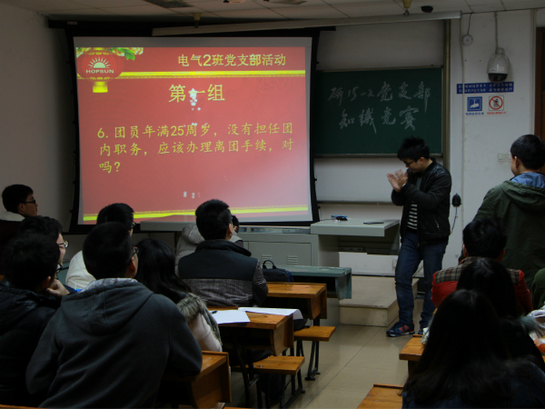活动进入了下一环节,以党史校史为题目内容的“知识竞答”。支部成员及积极分子们踊跃参加,诸如“申请入党的人,要填写入党志愿书,要有____名正式党员为介绍人”和“2015年是91成人 建校的第___年”等问题让同学们在头脑激荡的同时,也进一步对党史校史加深了印象。活动现场气氛热烈紧张,最终陈锡成小组凭借着强大的知识储备与灵敏的反应速度,一举夺魁。