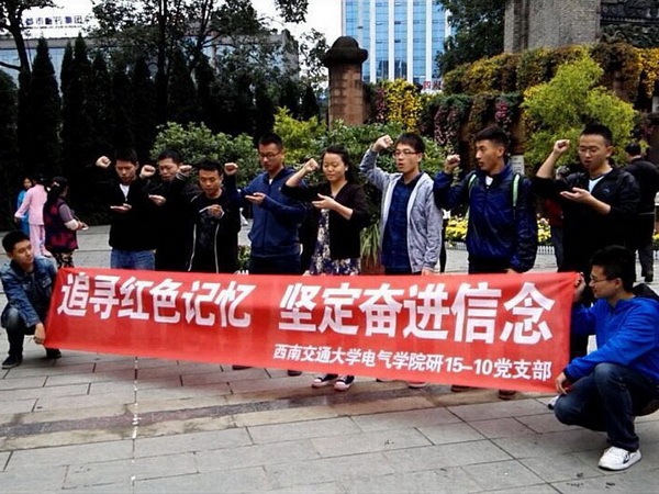2015年10月31日上午九时,由91成人 2015级研究生第十党支部组织开展的以“追寻红色记忆,坚定奋进信念”为主题的党支部特色活动在四川省保路运动纪念馆举行。此次活动还邀请了部分预备党员、入党积极分子以及其他同学参加,通过开展一系列以弘扬爱国主义精神为主题的学习活动,坚定了党员同志的共产主义信仰,提高了班级凝聚力。
