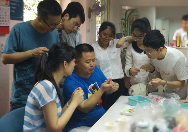经过约半小时的车程,同学们到达了位于小区内的残疾人康复中心,受到了“金牛阳光家园”朋友们的热情欢迎。负责人茜姐向大家介绍到,茶店子“金牛阳光家园”属残联系统内的残疾人康复中心,也是残疾人朋友的“梦想工场”,他们学习与制作手工艺品,作为一种自力更生的劳动技能。