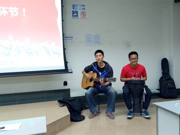 随后,委员们还特别邀请了明杰和刘洋同学来为大家现场演奏歌曲。在大家热烈的掌声下,两名同学带着自己的乐器走入了教室。在表达感谢之后,刘洋同学拿起吉他,明杰同学放好手鼓,热情洋溢的音乐流入大家的耳中。吉他声急促而饱含旋律,手鼓声有力而富有节奏,大家都陶醉在了这悦耳又生动的歌声中。演唱不经意间就已接近尾声,大家却仍沉浸在韵律中久久不能忘怀。终于,在同样热烈的掌声中,两位同学挥着手向大家致意并离场。竞赛迎来了最终的抢答环节。