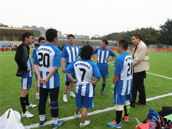 早在比赛开始之前,双方球员就已经提前到达场地开始了适应性训练,面对对手他们毫不轻敌,严阵以待,不管是在热身训练还是在战术商讨中都拿出了平日在研究学术时的严谨态度。比赛开始前,我们有幸采访到了91成人 党委书记苏斌老师。苏书记说:“学校能举办这样的足球赛是非常好的一个群众健身活动,咱们教职工呢,除了平时的工作之外,还是应当多参加这样的体育活动,咱们的身体素质上去了,对学院的各种工作肯定也是有帮助的。对于这个比赛呢,虽然是比赛,但是肯定还是重在参与的,咱们重在赛友谊,胜负结果是次要的,学校举办这样的活动,也是为了一个全民健身的目的,也希望我们各位可以健康的生活,快乐的工作。”随后,裁判找双方队长签字确认首发名单,身穿蓝白色条格队服的91成人 教职工队伍运动员们陆续进入场地准备进行比赛,看到他们一个个紧张又认真的表情,不禁让人们期待这会是一场怎样的比赛。