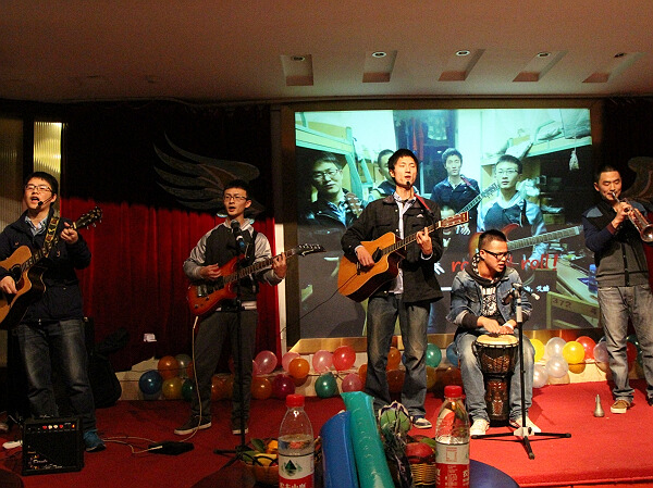 首先,一首《光阴的故事》引发同学们无限遐想,同学们似乎看到了多年之后自己的样子。紧接着,集体舞乱舞千秋让同学们眼前一亮,轻盈的步伐,明快的节奏,有些滑稽的舞步引得同学们捧腹大笑,台下的老师们也情不自禁地为他们鼓掌。由578乐队演唱的歌曲串烧《活着》《夜空中最亮的星》《蓝莲花》以其精湛的弹奏技术把晚会推向了高潮,台下的掌声、尖叫声和欢呼声此起彼伏,根本停不下来。