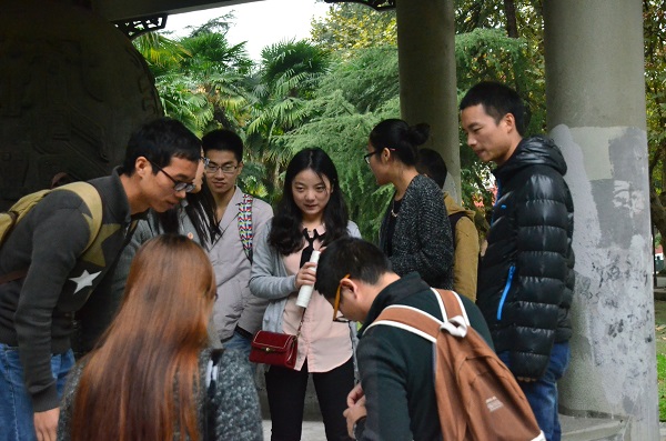 在交流会之后,开始了本次活动的高潮部分——校园定向游戏,由两校同学分组共同完成。深秋,虽寒风瑟瑟,但却依旧不影响川大的美丽,伴随着一路上需要完成的任务,双方结伴而行,相互介绍,熟悉了解。暮秋拾叶、与外国友人交流、扶自行车、目的地点寻找……这些小游戏把两校同学们刚见面时的陌生感和拘谨情绪一扫而空,在完成任务的同时,一路上更是欢声不断。在活动过程中,同学们还不忘舌尖上的攻略,品尝了川大的各种美食,医院小炒,重庆森林,甜品奶茶……