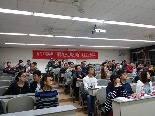 在主持人略显幽默的开场词下,交流会正式拉开了帷幕。首先,我们迎来的是胡海涛学长,胡学长为2011级博士,攻读我校电力系统及其自动化专业,2013年至2014年留学加拿大阿尔伯塔大学。胡师兄首先谈了国内与国外在研究生培养工作上的差异。随后胡学长就攻读博士以及博士阶段如何做好科研工作进行了详细的解答。他说:在决定读博之前需要弄清楚几个问题:我的个人能力是否适合读博?我读博的理由是什么?我有读博的环境和基础吗?针对以上的问题,胡学长现身说法,以自己为例,对以上问题一一作答,胡学长还特别强调,这里仅仅以自己为例子,同学们应该根据自己的情况进行不同的选择。最后,胡学长分享了自己的一些心得。胡学长说到,做研究要理论与实际相结合,不仅如此,还要在该吃苦的年纪有苦中作乐的精神,不要随便抱怨,更不可怨天尤人。做事要有恒心,要懂得坚持。最重要的一点就是,一日博士学位不到手,一日不可放松学习!