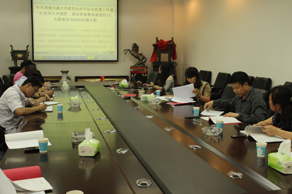会议开始何书记首先布置了“实现伟大中国梦、建设美丽繁荣和谐四川”主题教育活动,并为在场各位同志介绍了“中国梦主题教育”的主要内容、鼓励各位同志认真学习“中国梦主题教育”的相关文件,随后何书记又传达了顾书记报告的主要精神,并重点提出“作为党员要带头、带动周围人努力实现中国梦、交大梦,积极弘扬交大精神”。