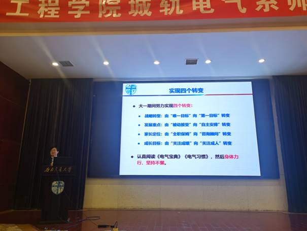 陈勇向同学们介绍了学院学生工作理念和学生管理相关规定。陈勇表示,学院将按照“统一协调指挥、统一工作标准、统一工作保障”的总体原则,不断完善工作体系架构,优化学生教育管理与服务工作。陈勇以“四个电气”建设为切入点,向同学们介绍《电气宝典》、《电气习惯》等电气特色读本,介绍“大学生优良习惯养成计划”、“清空行动”等学风建设举措,介绍“晚归零报告”、“辅导员深入学生联系学生”等学生管理制度。陈勇鼓励同学们更好地适应大学生活,养成良好的生活习惯,实现“四个转变”,身体力行,坚持不懈,努力成长成为一名合格的大学生和不断进步的电气人。