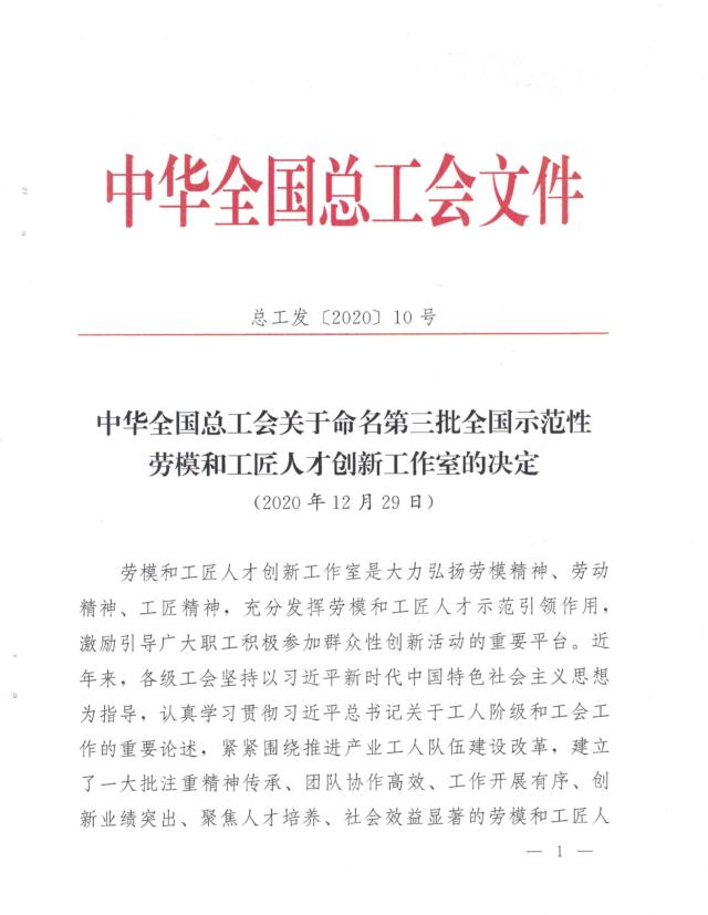 中华全国总工会希望获得命名的工作室珍惜荣誉、再接再厉,进一步增强创新意识、培养创新思维、展示锐意创新的勇气、敢为人先的锐气、蓬勃向上的朝气。全国广大职工要以全国示范性劳模和工匠人才创新工作室的先进代表为榜样,增强“四个意识”、坚定“四个自信”、做到“两个维护”,更加紧密地团结在以习近平同志为核心的党中央周围,焕发劳动热情,厚植工匠文化,恪守职业道德,将辛勤劳动 、诚实劳动,创新性劳动作为自觉行为,为全面建设社会主义现代化国家、实现中华民族伟大复兴的中国梦而不懈奋斗!