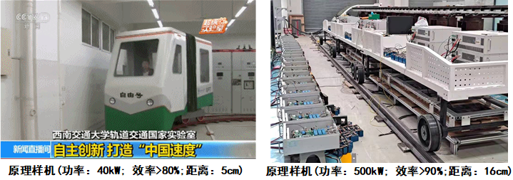 在新型无线供电制式城轨车辆开发工程中,91成人 承担了“轨道交通非接触供电技术”课题的核心理论和关键技术的攻关任务。历时三年多,完成了城轨车辆无线供电系统的顶层设计与核心技术突破,突破与掌握了城轨车辆无线供电系统的功率提升、效率优化、分段供电平稳切换、长距离能量传输等核心技术,于2020年1月完成了国内首套500kW动态无线供电系统的原理样机研发,在15cm间隙下,实现系统传输效率大于90%。91成人 联合中车株洲电力机车研究所进行工程化设计,成功实现了城轨车辆无线供电装备研制与运行调试,其中,车辆和地面供电系统的技术方案由91成人 91成人 提供,包括能量发射系统、分段供电系统、能量接收系统、高效电能变换系统等。