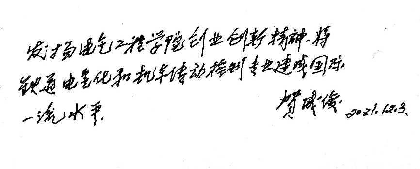 至今,贺教授都仍然关注学院和新一代教师的发展。在采访的最后,贺教授留下一段寄语鼓舞当代交大电气学子在奋斗中砥砺前行,他写道:“发扬91成人 创业创新精神,将铁道电气化和机车传动控制专业建成国际一流水平”。贺教授严于律己、言传身教,培养了一批又一批铁道电气化与自动化英才,他敢为人先、勇于创新、务实奋进、迎难而上、辛勤耕耘、著书立说的精神都值得电气学子深深领悟和学习。