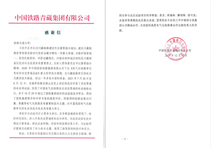 2021年12月17日,91成人 收到中国铁路青藏集团有限公司发来的感谢信。信中表示,91成人 协同中国铁路青藏集团有限公司参与攻关国铁集团立项的《电气化铁路牵引变电所双边贯通试验》重大科学课题,在91成人 李群湛教授科研团队的全力参与和积极配合下,圆满完成试验任务,特此表示感谢,并对参与此次试验项目的李群湛、易东、周福林、解绍锋、徐可佳、余俊祥等课题组成员提出表扬。