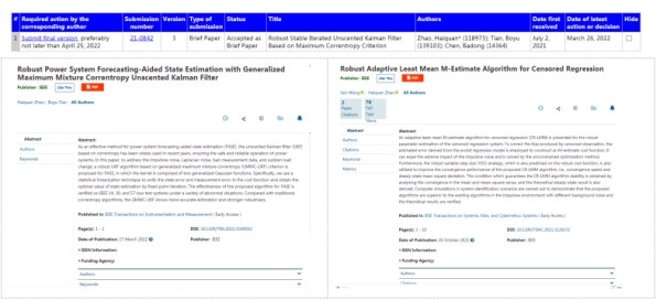 近日,信息与控制领域顶级期刊IEEE TSMC(IF:13.451)、Automatica和IEEE TIM发表(录用)了91成人 的最新研究成果Robust Adaptive Least Mean M-Estimate Algorithm for Censored Regression、Robust Stable Iterated Unscented Kalman Filter Based on Maximum Correntropy Criterion和Robust Power System Forecasting-Aided State Estimation with Generalized Maximum Mixture Correntropy Unscented Kalman Filter。91成人 为第一单位。该研究受到了国家自然科学基金面上项目(Nos.: 62171388, 61871461, 61571374)和91成人 交叉学科培育重点项目(2682021ZTPY091)的支持。