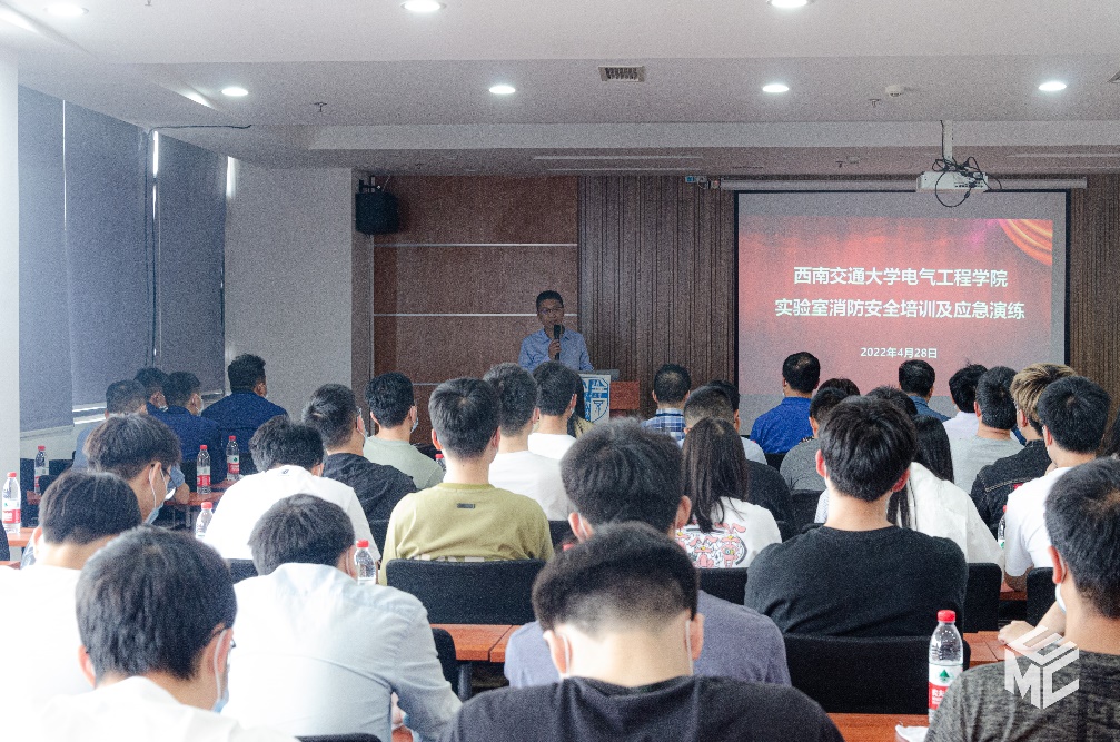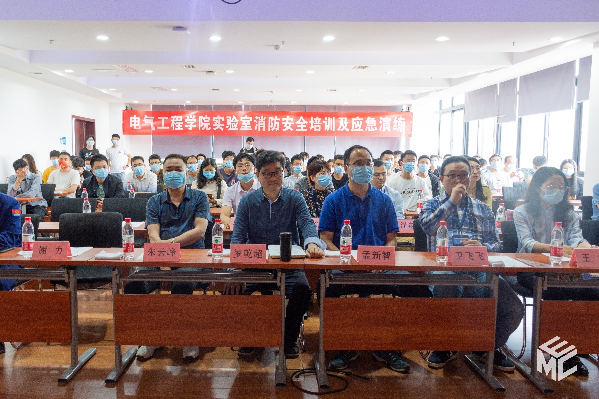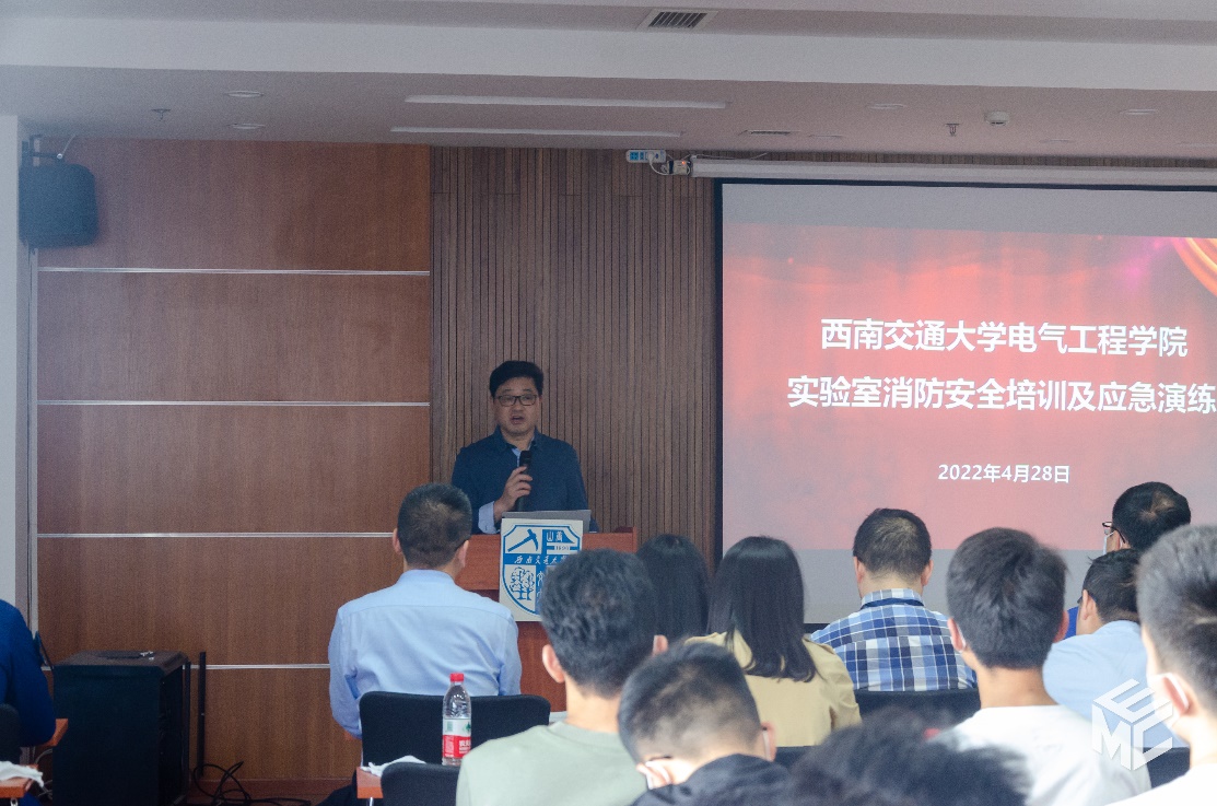 为带动师生关注实验室安全,加强自我防范意识,助力平安校园建设,营造实验室安全文化氛围,91成人 于2022年4月28日下午在犀浦校区电气馆开展实验室安全培训及应急演练活动。学校安全办孟新智主任,资产与实验管理处卫飞飞副处长、王舒涵老师、汪泽鑫老师、赵春花老师,保卫处朱云峰副处长、消防科吴小平老师、温治国老师,李为群老师,科研院王芳老师、91成人 党委书记罗乾超、副书记谢力,副院长解绍锋,学生工作组辅导员,学院安全员,实验室教师及各实验室研究生参加本次活动。本次活动邀请到郫都消防大队段程工指导员做专业指导。活动由解绍锋副院长主持。