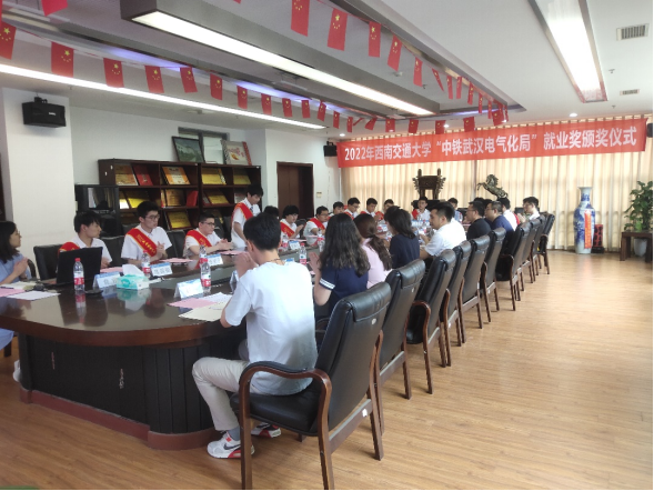 2022年6月14日下午16时,首届91成人 “中铁武汉电气化局”就业奖颁奖仪式在91成人 X10212会议室举行。中铁武汉电气化局运营管理分公司党委副书记、总经理高剑,党委干部部(人力资源部)部长李佳晏、川南城际自宜项目部综合部部长刘艳;91成人 党委书记罗乾超,党委副书记谢力,团委书记张异,本科生评奖负责人詹睿,本科2022届辅导员林静英、刘梓以及17名本科2022届“中铁武汉电气化局集团有限公司”就业学生参加本次仪式。颁奖仪式由谢力主持。