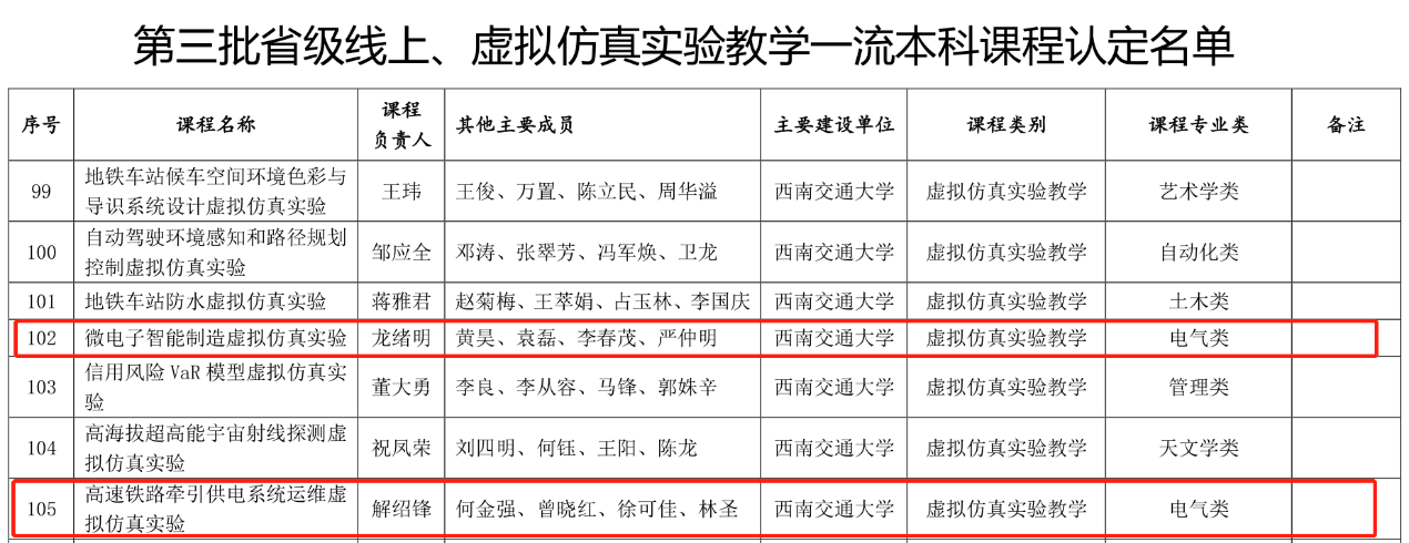 根据四川省教育厅发布的《四川省教育厅关于2022年省级一流本科课程认定结果的公示》和《四川省教育厅关于公布第三批省级线上和虚拟仿真实验教学一流本科课程认定结果的通知》(川教函〔2022〕321号),学院2022年新增9门省级一流课程(含公示),包括线上课程《电机学》、《电力电子技术》、《电路分析AI》、《信号与系统》,混合式课程《电力系统分析A (含实验)》、《电路与电子技术基础》、《电工技术B》,以及虚仿类实验课程《微电子智能制造虚拟仿真实验》和《高速铁路牵引供电系统运维虚拟仿真实验》。