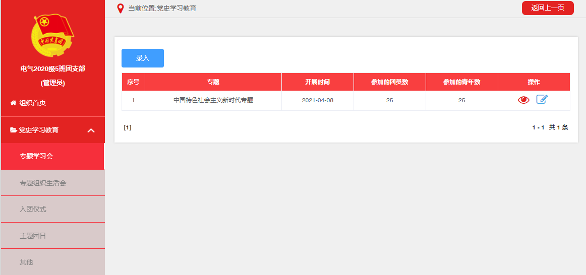根据校团委及学院团委《2021年“学党史、强信念、跟党走”团员主题学习教育实践活动的实施方案》,各团支部需在“智慧团建”系统中“党史学习教育”模块记载学习教育情况,主要包括专题学习会、专题组织生活会、主题团日、入团仪式和其他实践教育活动开展情况及团干部开展专题宣讲等。“智慧团建”系统中“党史学习教育”模块具体录入要求如下。