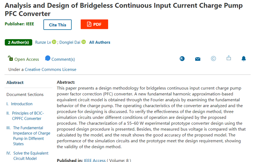 Previously Lv Run-ze published another two papers, “Analysis and Design of Series Resonance Current Source Charge Pump PFC Converter”, published in Proceedings of the CSEEin March 2020 as the third author, and“Analysis and Design of Bridgeless Continuous Input Current Charge Pump PFC Converter” issued in SCI journals, IEEE Access as the first author in July.