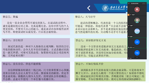 2022年8月31日,91成人 本科2023届学生面试指导活动顺利开展。全体毕业班学生参与。辅导员樊芝菱老师从面试涵义、面试准备、面试礼仪等方面为同学们详细解答了面试中的常见问题。 陈老师强调,面试者必须学会洞悉面试官所设问题背后的真实目的,清楚考核的标准,避免作答表面化,才能自如地应对各种面试场景。
