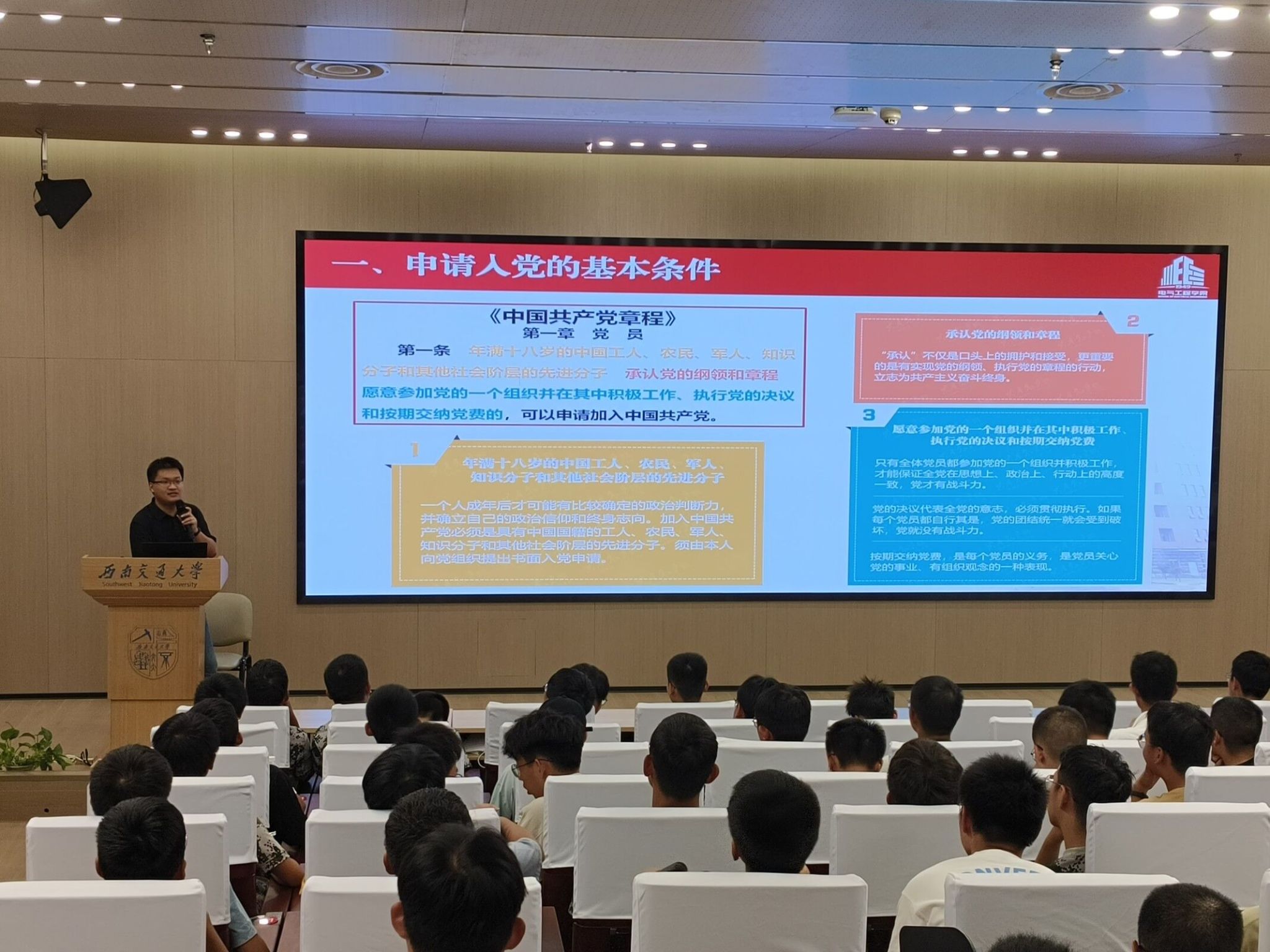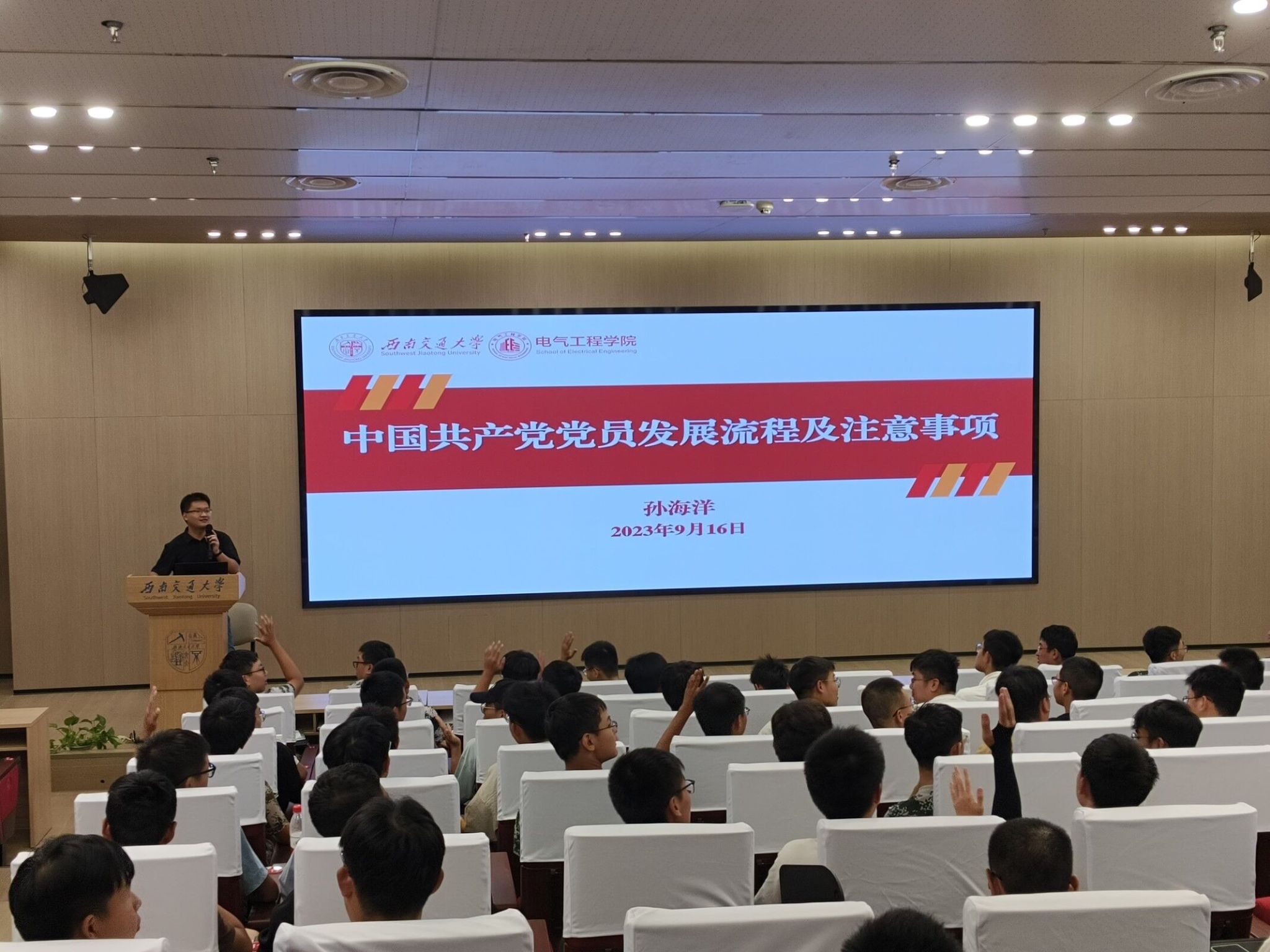 为深入学习贯彻习近平新时代中国特色社会主义思想,落实党的二十大重要精神,2023年9月16日晚上20:00,91成人 本科2023级在91成人 犀浦校区一号报告厅开展党员发展专题教育讲座。此次讲座由辅导员孙海洋老师主讲,91成人 本科2023级辅导员詹睿、罗霁轩和全体新生参与。