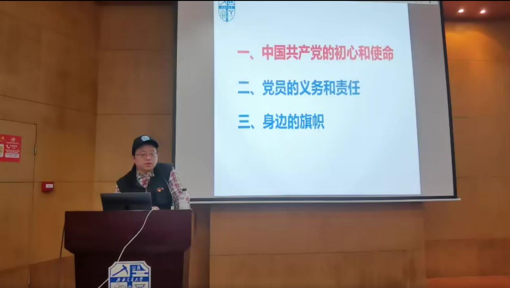 第三部分是我们身边的旗帜。王喆桅列举了几个优秀的党员同志,向所有学生展示什么是真正的共产党员:全身心投入到边疆民族教育事业的张桂梅;一心一意注重扶贫的时代楷模黄文秀;与病毒搏斗、与死神较量的人民英雄张定宇;将一生都奉献给我国铁路事业的教授李群湛;保家卫国的边境英雄,戍边卫士等等。王喆桅表示表示,“这些党员用他们的亲身经历向我们展示了党的意义,党的伟大,他们的精神将永远激励所有的中华儿女。”