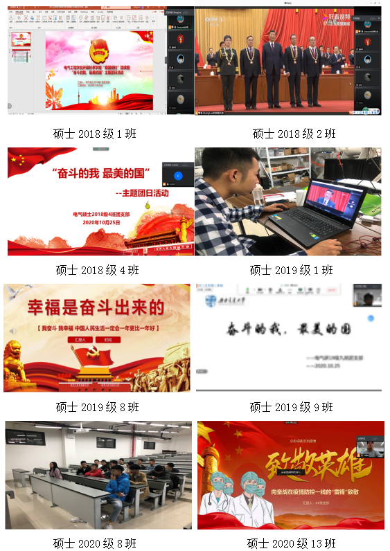 2020年10月,91成人 30个研究生团支部纷纷开展了以“爱国爱校”为主题的团日活动,活动主题类别包括“青春告白祖国”、“青春告白交大”、“奋斗的我,最美的国”和“厉行节约 反对浪费”,充分展现交大电气学子的爱国荣校热情。