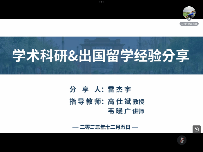 全球一体化作为当代社会的发展趋势,博士研究生应当立足中国、放眼世界,将科研论文写在祖国大地上。为帮助同学们提高英语应用水平和表现力,拓宽班级成员国际视野,12月5日晚19:30,91成人 2023级博士班在线上开展了“学术科研&出国留学经验分享”专题讲座。本次讲座特别邀请到91成人 2020级博士研究生、雅典国家技术大学电气与计算机学院联合培养博士雷杰宇主讲,辅导员沙静馨和2023级博士班全体成员共同参与。