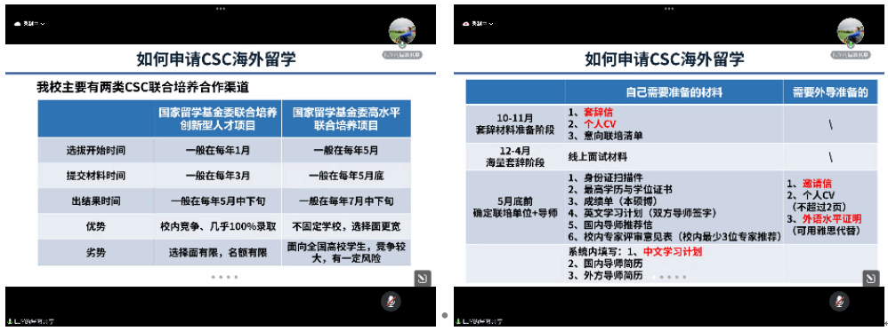 接着,雷杰宇博士基于自身申请经验向大家介绍了如何申请CSC海外留学。主要内容包括我校主要联合培养合作渠道的类别、个人需要准备的材料以及时间节点,同时建议同学们如果计划出国深造一定要早做准备,提高语言应用能力等。