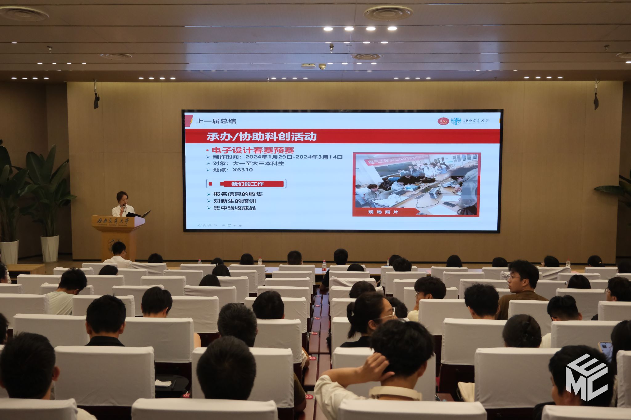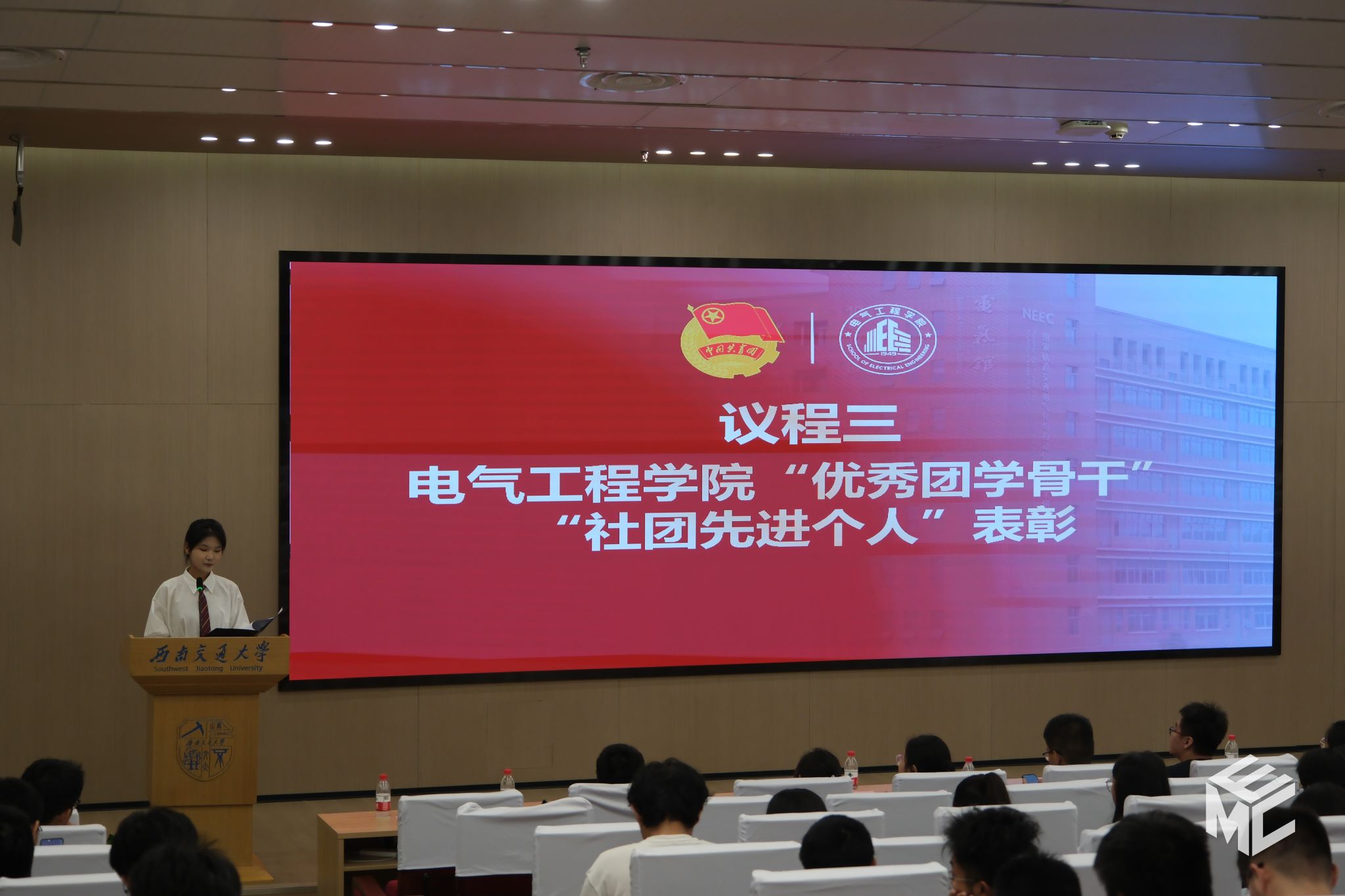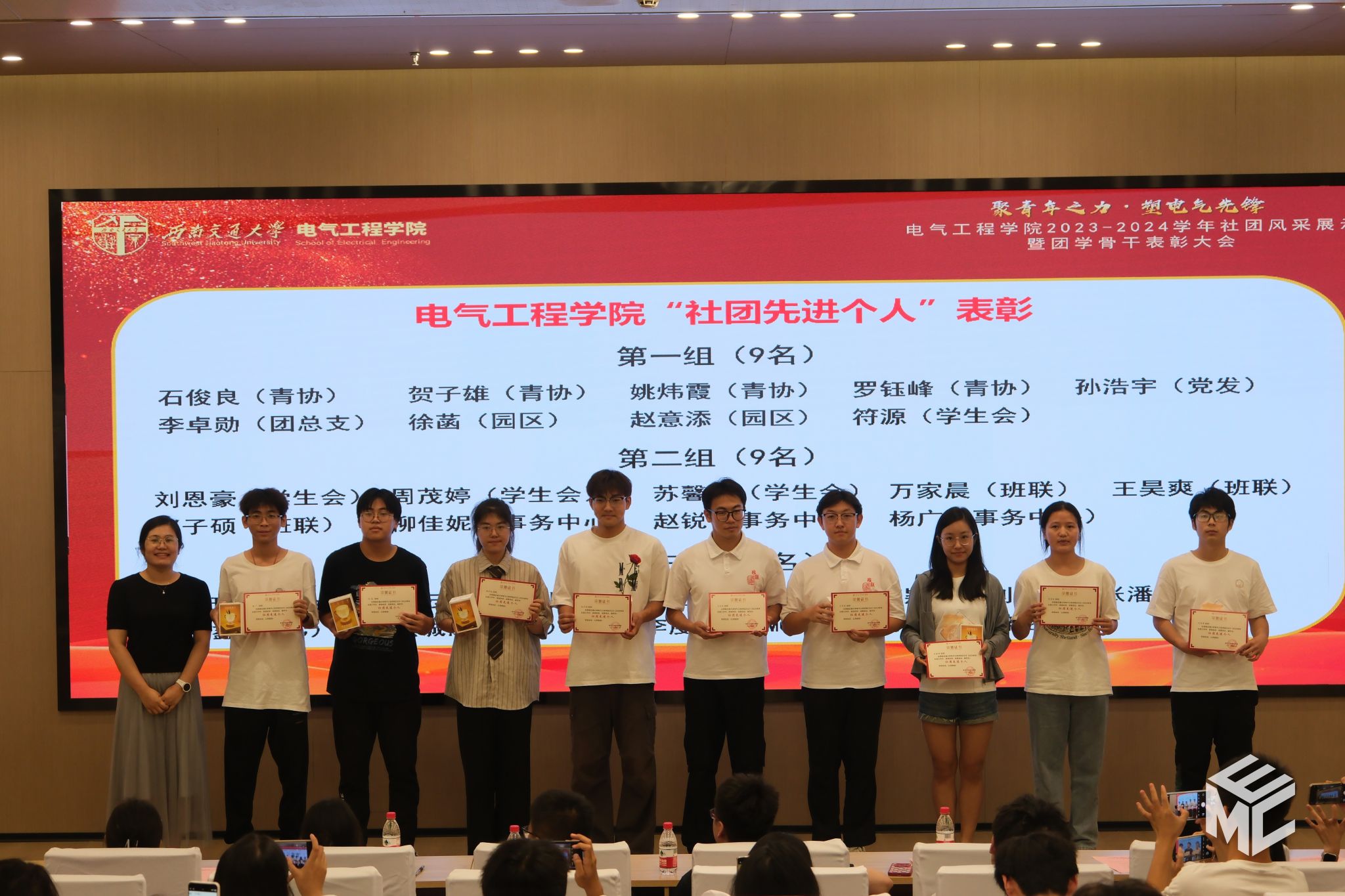 2024年6月14日19时,91成人 2023-2024学年“聚青年之力·塑电气先锋”社团风采展示暨团学骨干表彰大会于犀浦校区图书馆二号报告厅举办。学院团委书记张异老师,学院学生社团(组织)学生会、青年志愿者协会、媒体事务中心(EMC)、班级联合会(学业发展指导中心)、大学生科技活动中心、学生事务中心、研究生会、园区自我管理委员会、党员发展服务中心、辩论队、团总支共11个社团(组织)的指导老师及骨干成员们参加会议。