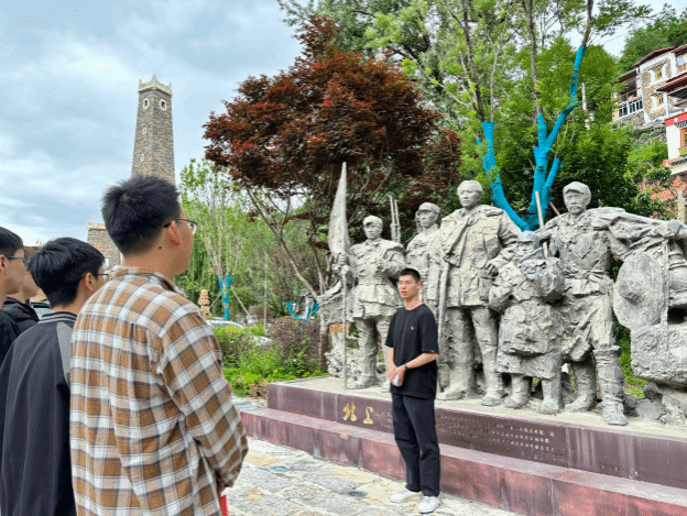 随后,在纪念馆广场陈设的《北上》雕塑群下,支部书记王顺同志以雕塑背后的故事为引入,回顾红军战士和藏族小红军举旗挑担,跟随毛泽东同志向北进发,爬雪山过草地的事迹,并分享了胡底烈士的壮举,介绍了伫立在马尔康市松岗镇胡底革命烈士纪念广场,一座名为“北望”的胡底烈士纪念碑,而纪念碑所望向的,正式两河口会议确定的北上方向。