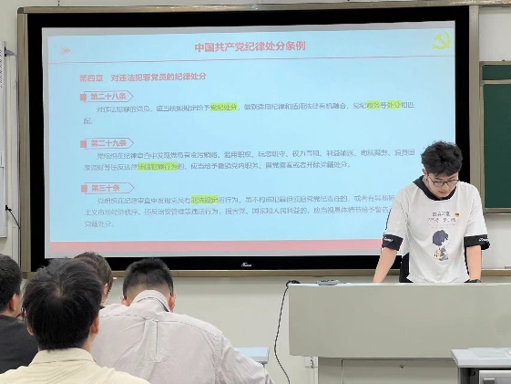 2024年5月17日上午10点,硕士2023级-04班党支部联合硕士2023级-03班党支部在犀浦校区X4133开展《学条例 守纪律 强党性》主题党日活动,主要学习了《条例》的制定背景、重要意义、基本原则,深入领会了党的纪律处分的种类、程序和依据,全面了解了党的纪律要求和对违反纪律行为的处分规定。
