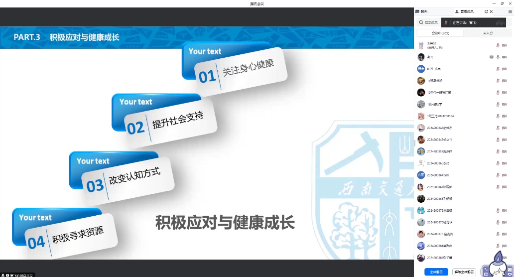 最后,高飞老师从关注自身身心健康、提升社会支持、改变认知方式和积极寻求资源四个方面,给出了遇到心理问题时的解决参考。