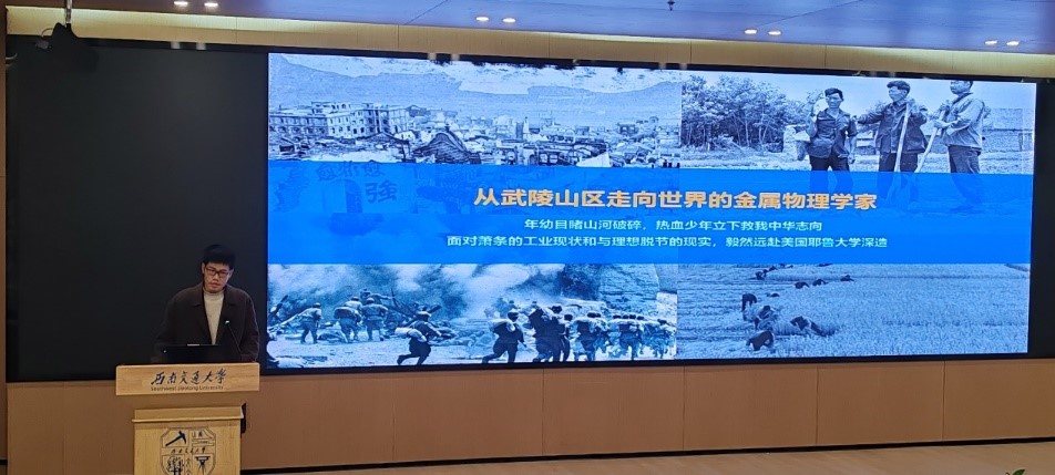 首先,由高朝阳同学向大家分享我校陈能宽院士的家国情怀和科学家故事。陈能宽院士是从武陵山区走向世界的金属物理学家,年幼时目睹山河破碎,立下了救我中华的志向,面对萧条的工业现状和与理想脱节的现实,毅然选择远赴美国耶鲁大学深造。在新中国成立之后,陈院士毅然决然放弃一切,回到百废待兴的新中国,回国后为适应国家建设需要,多次转行,后研究陌生的爆轰专业,研究如何使用炸药引爆原子弹。为完成中国原子弹、氢弹的研制,陈能宽院士从事爆轰物理、炸药工艺与炸药物理化学、特殊材料冶金、实验核物理等学科领域的研究和工作,做出了重要贡献。